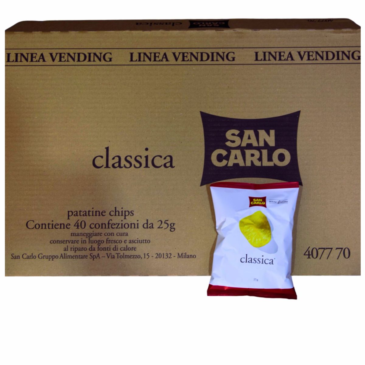 Assicurati la presenza di uno degli snack salati più venduti. Acquista le Patatine Classica San Carlo 40 x 25 gr su esvending.it e offri ai tuoi clienti la garanzia di un gusto autentico e la praticità della monoporzione.